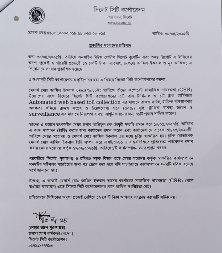 কয়েকটি অনলাইন নিউজ পোর্টালে “১২ কোটি টাকার কাজ দেখিয়ে ভুয়া অভিজ্ঞতা সনদ” শিরোনামে যে সংবাদ প্রকাশিত হয়েছে, তা সিলেট সিটি কর্পোরেশনের দৃষ্টিগোচর হয়েছে। এ বিষয়ে সিটি কর্পোরেশনের পক্ষ থেকে স্পষ্ট ব্যাখ্যা ও প্রতিবাদ জানানো হয়েছে।